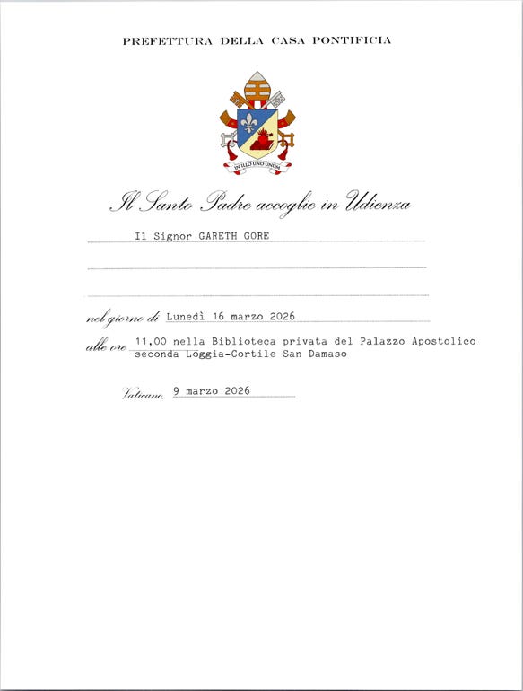 Nei giorni successivi, ho scambiato messaggi WhatsApp con un intermediario in Vaticano, a cui era stato chiesto di organizzare l’incontro. Poi, le linee di comunicazione sono andate misteriosamente tranquille. Qualcuno all’interno della Santa Sede aveva distrutto l’incontro, mi chiedevo – la mia udienza con il Papa veniva rinviata a tempo indeterminato? Dopo aver riferito dell’Opus Dei negli ultimi sette anni, sapevo fin troppo bene dell’influenza del gruppo all’interno del Vaticano. Per fortuna, i miei sospetti si sono rivelati fuori luogo. Due settimane dopo, arrivò la conferma – sotto forma di un invito ornato dalla Prefettura della Casa Pontificia.